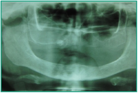Se establece como diagnóstico clínico: quiste residual y como diagnóstico diferencial: quiste del desarrollo, tumor odontogénico y no odontogénico y mucocele. Se realizan radiografías periapicales, oclusal, teleradiografía de frente con incidencia de Waters y una ortopantomografía. Del conjunto se hace la siguiente lectura: lesión corticalizada con una extensión promedio de entre 25 mm. de alto y 35 mm. de largo, dividida la misma por un tabique. En la porción más posterior existe una ligera fenestración en el piso del seno maxilar. Se constata también un elemento radiopaco a la altura de la pieza dentaria 13 rodeado por un halo radiolúcido nítido (Fig. 3).