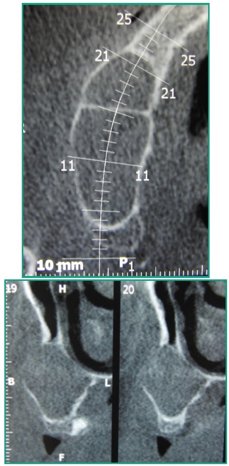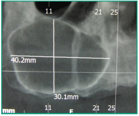 A efectos del diagnóstico y plan de tratamiento se indica una Tomografía Computada (TC), examen realizado a través de adquisición de haz cónico único de rayos X, donde se corroboran las medidas de la lesión de 40.2 mm. en sentido ántero posterior por 30.1mm en sentido vertical. En todos los cortes tomográficos se observa que el seno maxilar derecho está ocupado por una lesión, con un tabicamiento a la altura del 13, que no deforma la pared nasal del seno maxilar (Figs. 4, 5).