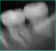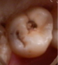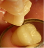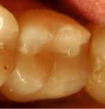 Paciente de sexo masculino de 23 años, con piezas 27 y 28 con caries profunda, ecosistema cerrado y cámaras amplias en análisis clínico radiográfico (figs. 4a,b). Se plantea tratamiento conservador en 27 y extracción en 28 ya que no ocluye con antagonista. En 27 se abre esmalte socavado, se elimina con cucharita la dentina necrótica reblandecida superficial, constatando ligera sensibilidad sin comunicación. En el análisis dentinario se observa dentina de color amarillo, blanda y húmeda, o sea con las características de una caries muy activa (Fig 4c).