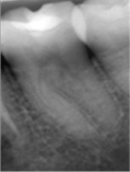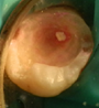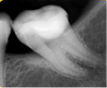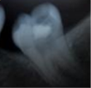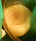En 2011 concurre paciente de sexo masculino, de 22 años, por caries profunda en pieza 38. Radiográficamente se destaca la cercanía de la cavidad cariosa con respecto a la amplia cámara pulpar (Fig. 3a). Se diagnostica CPPA, luego de eliminar la dentina necrótica reblandecida superficial con cucharita de dentina y verificar su vitalidad con test de fresado. En la evaluación dentinaria se constata dentina de color marrón, blanda y húmeda. Se planifica Técnica de eliminación de caries en etapas. La Fig.3b muestra eliminación total de caries de paredes laterales con control colorimétrico sin tocar la pared pulpar.