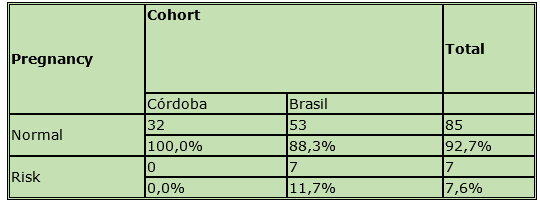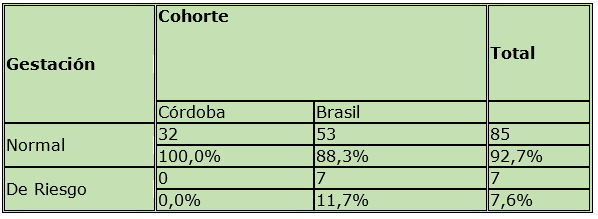 Como se puede observar en la tabla 10, el 100% de los niños de Argentina tuvieron gestación normal, en tanto que en los de Brasil el porcentaje fue de 88,3%, aunque las diferencias no resultaron significativas (Fisher: p=0,091; p>0,05).
