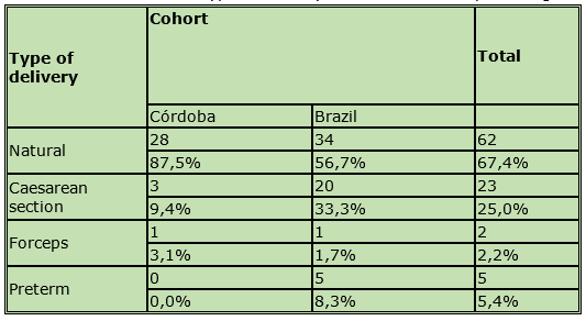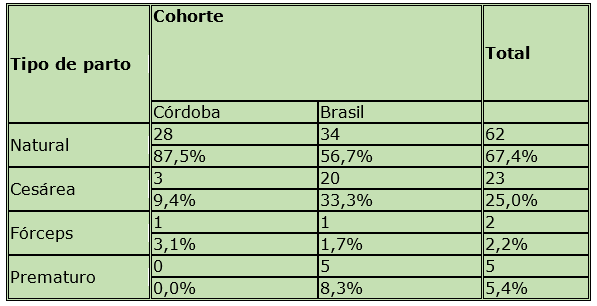 Las diferencias entre cohortes resultaron estadísticamente significativas al considerar la variable tipo de parto (tabla 11), el 87,5% de los niños de Córdoba-Argentina nació por parto normal, porcentaje muy por encima del registrado en los niños de Porto Alegre-Brasil (56,7%), en esa cohorte, el nacimiento por cesárea fue de 33,3% (un tercio de los niños), (Chi2 de Pearson: p=0,014; p<0,05).