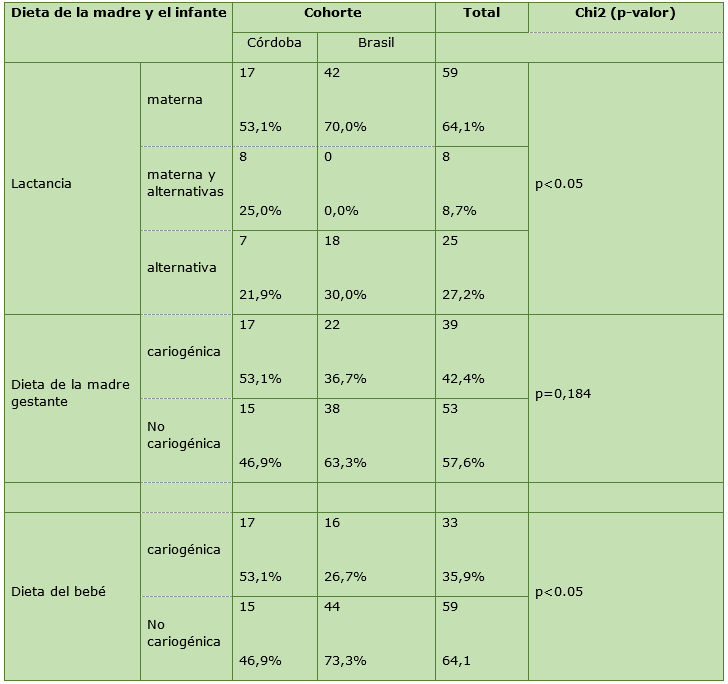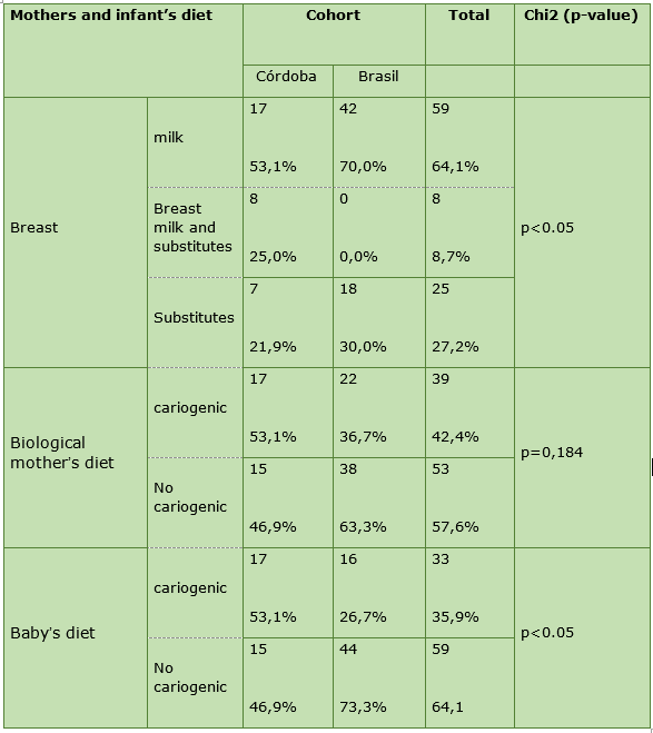 En cuanto a las características de la dieta de la madre y el infante (tabla 12), se observó que el porcentaje de niños de Brasil que tomaba leche materna (70%) fue mayor que el del grupo de Córdoba (53,1%) (Chi2 de Pearson: p<0,05). Más de la mitad de las madres de Argentina consumían alimentos cariogénicos durante la gestación, mientras que este porcentaje fue menor en madres de Brasil (36,7%). Las diferencias no resultaron estadísticamente significativas (prueba de Chi cuadrado; Test Exacto de Fisher: p=0,184; p>0,05). La dieta del bebé, mostró diferencias estadísticamente significativas (Fisher: p=0,022 p<0,05). Más de la mitad de los niños de la cohorte de Córdoba tenían una dieta cariogénica (53,1%), contra sólo un 26,7% de los niños de Brasil.
