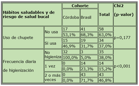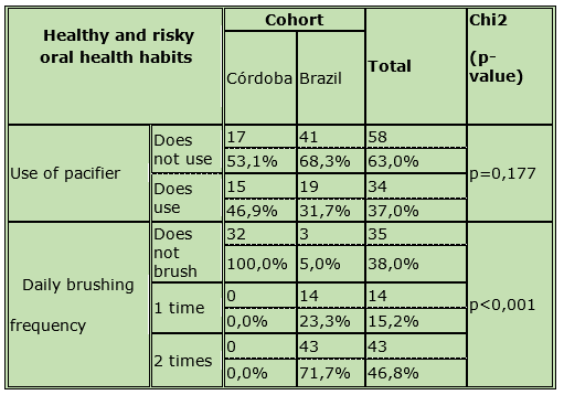 Respecto a hábitos saludables y de riesgo de salud bucal se pudo observar (tabla 5) que el porcentaje de niños que usa chupete es mayor en la cohorte Argentina (46,9%), en contraste con la cohorte brasilera (31,7%). Las diferencias no resultaron estadísticamente significativas (Fisher: p=0,177; p>0,05). Los niños de Argentina no tienen el hábito de higiene bucal, siendo significativa la diferencia con la cohorte de Brasil, (Chi2 de Pearson: p<0,001), en consecuencia, igual comportamiento presento: uso de dentífrico, uso de flúor, frecuencia diaria de higienización y momento de higienización.