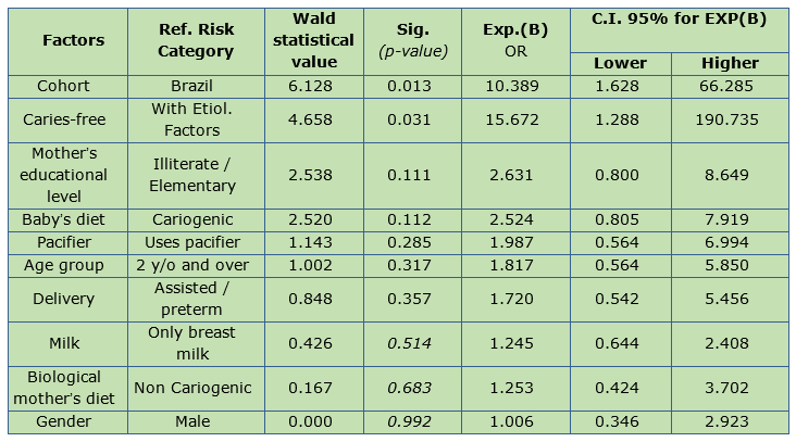 Si bien no resultaron significativas las diferencias entre cohortes respecto a la condición libre de caries (tabla 4) (Fisher: p=0,178; p>0,05), el porcentaje de la categoría que no presentaba factores etiológicos fue mayor en el grupo de los niños brasileños (96,7%) frente a los niños cordobeses (87,5%).