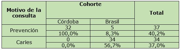 El motivo de la consulta en ambas cohortes se muestra en la tabla 2, siendo el 100% de carácter preventivo en los niños de Argentina, en contraste, los niños de Brasil que concurrieron por este motivo sólo el 8,3% y más de la mitad 56,7% lo hizo por caries. (Chi2 de Pearson: p<0,001).
