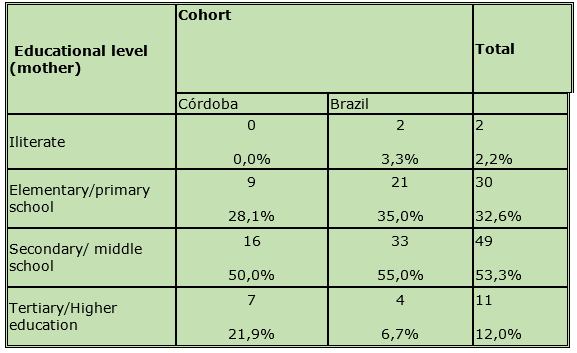 En términos generales el nivel de estudios de las madres (tabla 8) de ambas cohortes fueron semejantes, sin diferenciarse significativamente (Chi2 de Pearson: p=0,138; p>0,05). No obstante, se verificó una diferencia significativa (p<0,05) en la categoría nivel terciario / superior.