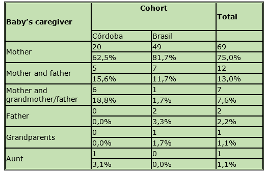 Se observaron discrepancias significativas entre cohortes al considerar el responsable del cuidado del bebé (tabla 9) (Chi2 de Pearson: p=0,026; p<0,05), puntualmente al considerar las categorías: exclusivamente madres y la compartida entre madres y abuelos (pruebas Z; p<0,05).