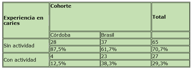 En cuanto a la experiencia de caries, (tabla 3) se observaron diferencias significativas entre las cohortes (Fisher: p=0,015; p<0,05), verificándose un mayor porcentaje de niños brasileños con actividad de caries (38,3%), en contraste con los niños argentinos (12,5%).