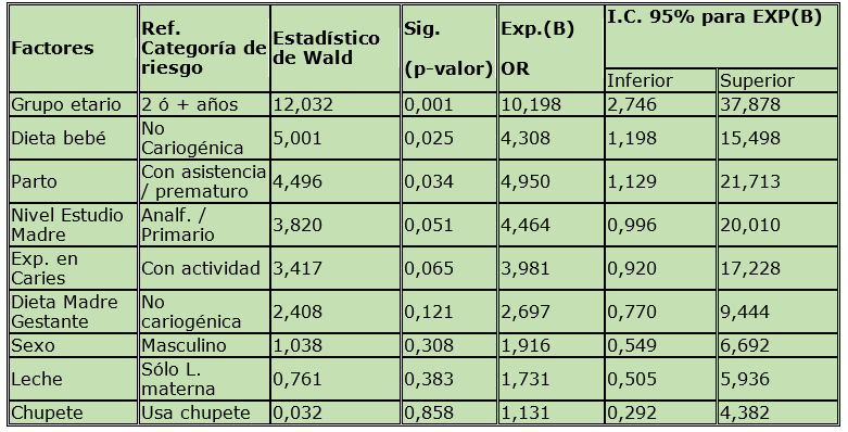 En la tabla 6, se muestran en orden decreciente de significatividad, los factores asociados a la experiencia de caries. Se calcularon las OR de cada factor detallando en cada caso la categoría de referencia tomada en relación al riesgo de actividad cariogénica. Las variables cohorte y libre de caries resultaron las más relevantes.