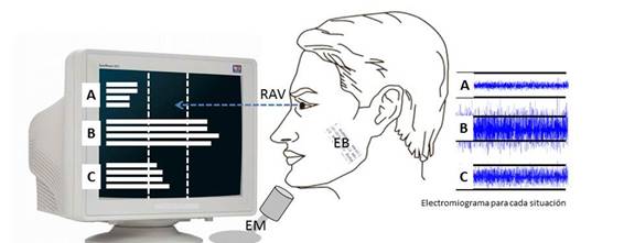 Para la retroalimentación visual, el EMG rectificado e integrado se presentó bajo forma de barras coloreadas en un monitor. El reflejo inhibitorio se obtuvo por la aplicación de un estímulo neumático estandarizado en el mentón. Para esto se utilizó un reflexímetro construido sobre la base de un microprocesador asociado en paralelo a un computador personal y cuya respuesta mecánica (martillo) es controlada por retroalimentación visual.