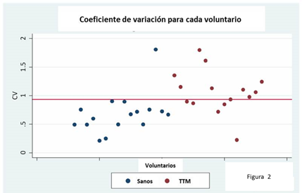 Esta nueva variable se muestra promisoria en cuanto al potencial diagnóstico, evidenciando una alta especificidad. Es posible que la sensibilidad pueda mejorarse al aumentar el número de repeticiones en el set experimental, de manera tal que la dispersión tenga un mayor impacto. Futuros trabajos probarán esta hipótesis.