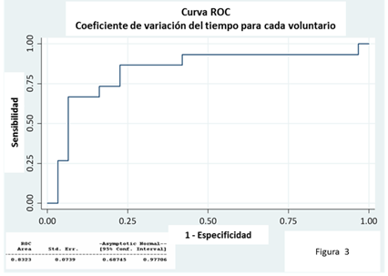 Los coeficientes de variación y los desvíos estándar fueron diferentes entre los grupos analizados (p< 0.01 y p=0.02 respectivamente).Un coeficiente de variación mayor a 0.936 fue encontrado, determinando de esta manera, una especificidad del 93.7% y una sensibilidad del 60%.(Figura 2). La curva ROC se ilustra en la Figura 3.