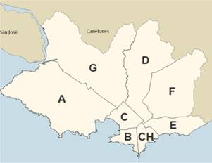 La exposición al tabaco, el auto - reporte de padecer enfermedades sistémicas y la necesidad de prótesis fueron clasificadas como variables dicotómicas (0 - ausencia/ 1 - presencia). Por otro lado, las piezas dentales perdidas se consideraron en forma cuantitativa. Particularmente para la edad se calculó la media por grupo además de subdividir en franjas etarias: 15 - 24 años y 25 - 35 años. El municipio de residencia se categorizó en dos estratos: 0 - “Nivel socio económico Bajo” (Municipios A, D, F y G) y 1 - “Nivel socio económico Alto” (Municipios B, C, Ch y E). (Fig. 1 - Mapa de Municipios de Montevideo) 35.