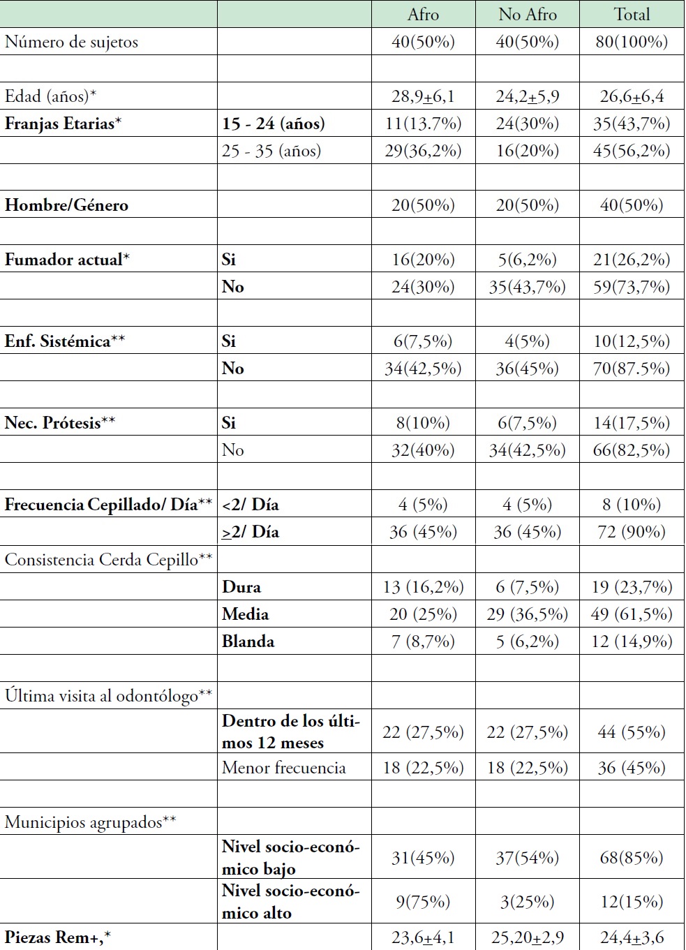 La población afrodescendiente se integró a los sectores populares de la sociedad. Respecto a los dientes remanentes, los afrodescendientes tienen en términos promedio un diente menos que los no afrodescendientes. A su vez presentan mayor prevalencia, extensión y severidad de Pérdida de Inserción Periodontal al compararlos con no afrodescendientes. Para la franja etaria considerada no se encontraron diferencias significativas en relación a la Profundidad de Sondaje en las poblaciones examinadas.