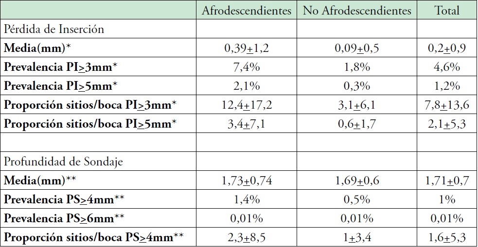 Los afrodescendientes presentaron mayor prevalencia de PI >3mm (7,4% versus. 1,8%) y 5 mm o más (2,1% versus. 0,3%, p=0,0000) así como más sitios con PI>3mm 12,4+17,2 versus. 3,1+6,1 y >5mm 3,4+7,1 versus. 0,6+1,7, p=0,0000. También evidenciaron mayor severidad de PI que los no afrodescendientes, 0,39mm+1,2 versus 0,09mm+0,5, p=0,0000.