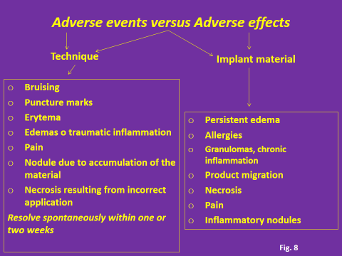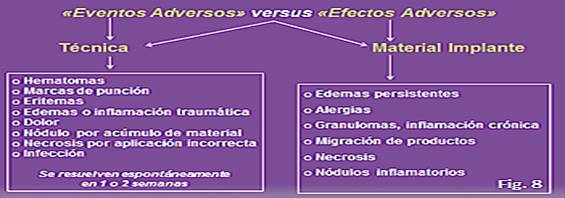 En referencia a las Reacciones Adversas causadas los por materiales de implantación, existen algunos reportes confrontados, quizás porque muchos autores y traducciones, utilizan indistintamente los términos: “Reacción adversa” y “Evento adverso”(Fig. 8). La prevalencia de los efectos adversos del AH de algunas fuentes consultadas, las cifran por debajo del 1%79 y otras según la marca empleada, hasta un 3%80, siendo las mismas fácilmente manejables y sin secuelas5,12. Para este estudio hemos considerado que la OMS81) y OPS82 definen como “Reacción Adversa: a unarespuesta nociva frente a un producto medicamentoso, no intencionada, y que se produce a dosis normalmente utilizadas en los seres humanos con finalidad preventiva, terapéutica…” El “Evento Adverso”(83 a diferencia de la Reacción adversa no está relacionado con el material, sino con la Técnica empleada83, por lo cual desaparecerá en pocos días, aun cuando el producto persista implantado, con la excepción de aquellas “necrosis” por una ubicación del material muy superficial o embolizaciones del mismo. Existen reportes que no diferencian claro ambas eventualidades84, tal cual se presentan en la Fig 8, cuyos conceptos se aplican al trabajo presentado.