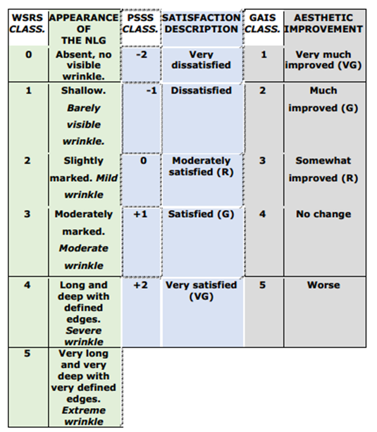 Población: tamaño de la muestra: 40 pacientes, de muestreo no probabilístico. La afluencia fue por goteo de tipo intencional y por demanda o conveniencia del paciente durante los años 2015 y 2016. Criterios de inclusión: Hombres y mujeres (n=40) de rango etario 35 a 75 años, con SNL marcados por envejecimiento, en pacientes dentados y/o rehabilitados protéticamente. Se incluyó los casos de grados 2 al 5 de la clasificación de Wrinkle Severity Rating Scale (WSRS)18. Fig.3. Criterios de exclusión: Enfermedades del colágeno y otras patologías agudas/crónicas, locales o sistémicas que contraindiquen el procedimiento. Antecedentes o presencia en la zona a tratar, de otros materiales de relleno biodegradables o permanentes. Negativa a firmar el consentimiento informado y/o al seguimiento clínico-fotográfico que pudiera ser publicado con finalidad científico-académica. Falta de rehabilitación protésica que fuera necesaria.