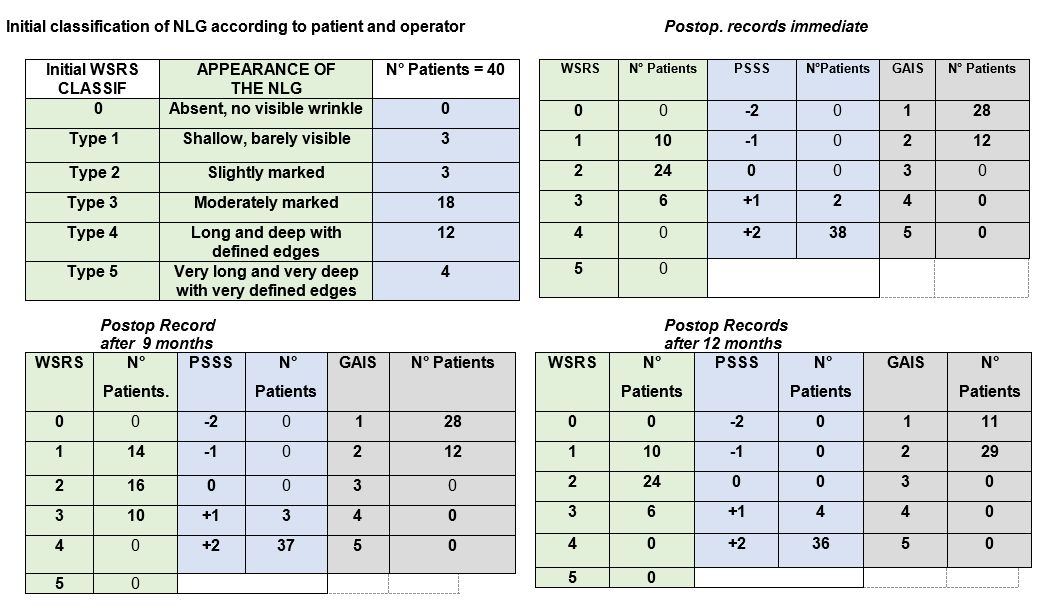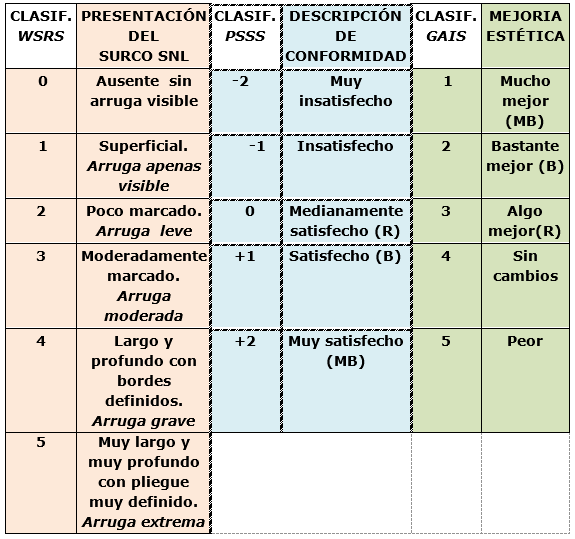 En los 40 casos se utilizó para el diagnóstico inicial y final (clínico-fotográfico) la clasificación WSRS18, con grados del 2 al 5 por el operador responsable de la investigación. Para los controles post-implantes, también se utilizó la clasificación por: WSRS, y las escalas Global de Mejoría Estética (GAIS) de investigador y paciente: 1 a 5; y de Satisfacción Propia de los Pacientes (PSSS): - 2 a + 2. (19-22.(Fig. 3)