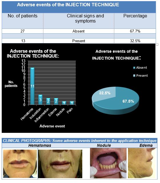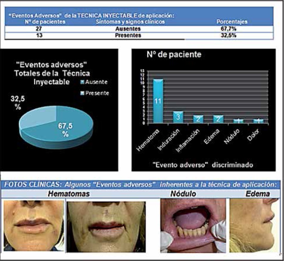 En 27 pacientes = 67,5%, no hubo eventos. En 13 pacientes = 32,5% de los casos tratados) los hubo y remitieron entre 1 y 15 días, a excepción de dos nódulos en un paciente, que se disiparon en el curso de tres meses. Coexistieron “eventos” en algunos de los 13 casos: Hematomas (11), Induración (3), Inflamación con/sin enrojecimiento (2), Edema(2), Nódulo(1) -deposición fuera de plano del material- y Dolor(1).Descriptos en