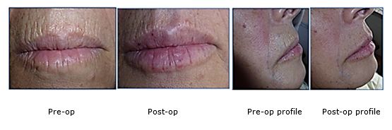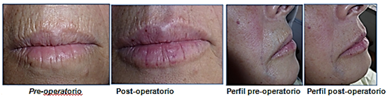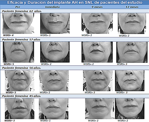 Los cuatro casos clínicos de la Fig.4, avalan la eficacia obtenida en la corrección de los SNL en todos los pacientes. En la Fig. 1.b. se puede apreciar un esquema de los sectores dérmicos en los cuales es aplicable el AH1-5,17,25):: “superficial”, “medio” (para SNL) y “profundo”. En el caso clínico de la Fig. 6, además de la corrección de los SNL, se muestra una implantación en la “dermis superficial y media” labial y peri-bucal de AH, donde se alcanza una mejoría estética muy importante (de frente y perfil del paciente).