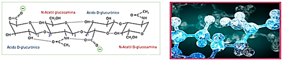 Éstas alteraciones muchas veces son sub-diagnosticadas por el odontólogo y ameritarían un tratamiento con rellenos dérmicos3 y otros productos (toxina botulínica)7. El AH sería actualmente el material más recomendado y el que más se acerca al implante ideal5. Es un polisacárido natural presente en el líquido extracelular de todos los seres vivos, idéntico en todas las especies y en todos los tejidos1-5,8-9-17 por lo cual no genera actividad inmunológica. Químicamente es un «glucosaminoglicano sulfatado» compuesto por unidades repetidas de disacáridos de: Ác. Glucurónico y N-acetil- D glucosamina unidos por ligandos alternantes: heparan, condroitín, dermatan sulfato y heparina (Fig.2). PMAH= 4 millones Da y largo=10 micrones. Es producido por enzimas sintetasas de AH presentes en la membrana plasmática de los fibroblastos, y liberado al medio extracelular. Su molécula es lineal, uniforme, muy ácida, con numerosas cargas negativas, es altamente hidrofílica e hidrosoluble, características que le permiten atraer grandes cantidades de agua y sodio, lo que consecuentemente incrementa la hidratación y elasticidad de la piel. 1-6,8-17. Se dispone sin forma definida haciendo ovillos y entrelazándose como red o malla en la matríz extra-celular.