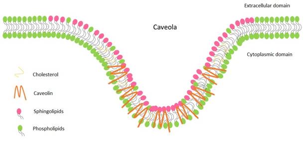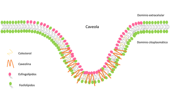 Las caveolas son invaginaciones de 50-100nm ubicadas en la membrana plasmática enriquecidas en colesterol y esfingolípidos. Cada caveola se encuentra conformada a su vez por aproximadamente 100-200 proteínas integrales de membrana denominadas caveolinas 4.
