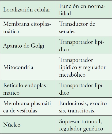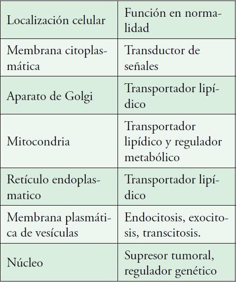La actividad de gran cantidad de proteínas señalizadoras puede ser alterada al cambiar su expresión a nivel de la superficie celular, y esta expresión puede ser regulada por cav-1 a nivel de la membrana a través de procesos de endocitosis y exocitosis. A su vez, la endocitosis dependiente de cav-1 regula la unión celular por internalización de integrinas y componentes de uniones estrechas (occludens) y de adherencia. Por su parte, la función como mediadora de la transcitosis le permite el transporte de albumina y nutrientes conjugados, ácidos grasos y hormonas, a través del endotelio 7. A nivel nuclear, cav-1 actúa como regulador genético y supresor tumoral. El gen CAV-1 que codifica a la proteína cav-1, es un gen supresor tumoral y regulador negativo de la cascada Ras-p42/44 MPAK 12. Esta proteína se encarga de la unión de las integrinas con la tirosina quinasa previo al inicio de la vía Ras-MAPK para promover la progresión del ciclo celular 13.