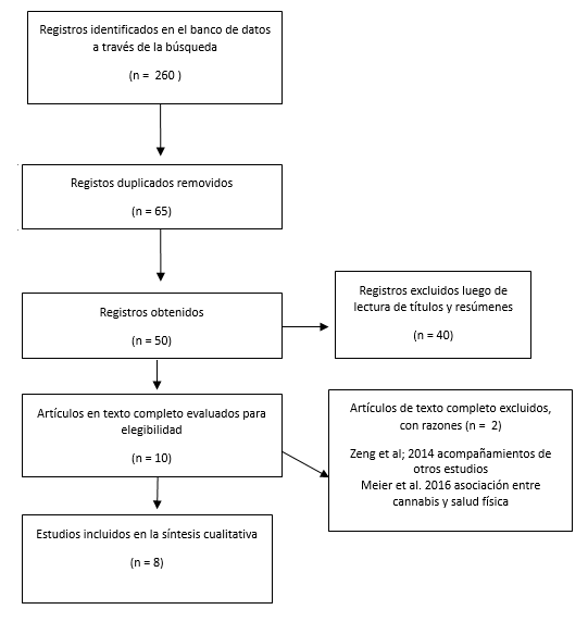 Estrategia de búsqueda: Se realizó una búsqueda estructurada en PubMed/ MEDLINE, Science Direct, LILACS, SciELO hasta mayo de 2017. Se aplicaron palabras clave y terminología controlada (términos MeSH) basados en preguntas estructuradas por el modelo PICO: "¿Cuál es la posible influencia del consumo de cannabis en la enfermedad periodontal ", donde se definió: