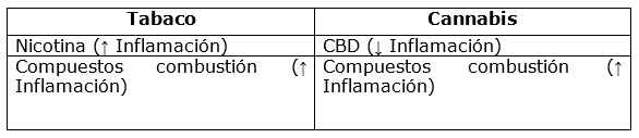 Influencia del cannabis en la enfermedad periodontal: El Cuadro 1. muestra el impacto del cannabis en la enfermedad periodontal según las acciones de sus componentes químicos. Autores adjudican como causantes de la inflamación crónica producida en pacientes consumidores de cannabis a las altas temperaturas y los químicos liberados durante el consumo, seguido del síntoma clínico de xerostomía (por ser una droga con propiedades parasimpaticolíticas), lo que potenciaría el efecto patológico 32. Se debe tener en cuenta que los constituyentes no cannabinoides del cannabis (productos de la combustión) son similares a los del tabaco, pudiendo influir local y sistémicamente. 21,22,33. Se destaca que solamente bajas concentraciones de CBD pueden causar efecto antiinflamatorio, mientras que altas dosis tendrían efecto contrario 34.