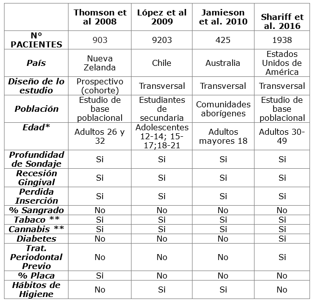 En este contexto, el primer estudio epidemiológico que investigó la relación entre cannabis y enfermedad periodontal se llevó a cabo el año 2008 por Thomson y col. 21 en Nueva Zelanda. La población estaba conformada por adultos que habían nacido en un hospital de dicho país entre los años 1972 y 1973. El examen clínico periodontal se realizó en dos ocasiones, a los 26 y a los 32 años. El sistema de registro incluyó 2 cuadrantes en 3 sitios por diente, examinando la Recesión Gingival (RG), Profundidad de Sondaje (PS) y Pérdida de Inserción (PI). La exposición al cannabis fue valorada en forma auto reportada. A partir de dicha información se obtuvieron 3 grupos: 1) No exposición 2) Baja Exposición (1-40 ocasiones en el último año) y 3) Alta exposición (más de 41 exposiciones el último año). También se consultó sobre el nivel socioeconómico, el consumo de tabaco, sexo, causa de visitas al servicio dental, y acumulación de biofilm 21.