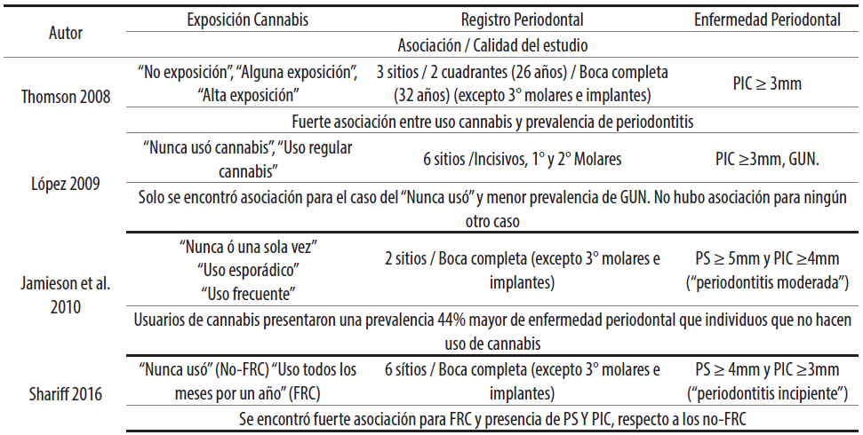 Casos clínicos: Dos casos clínicos fueron incluidos en la presente revisión 29,30. Los trabajos revelan que el consumo prolongado de cannabis puede resultar en un agrandamiento gingival con características clínicas semejantes a lo que acontece por la acción de la fenitoína 30 además de periodontitis crónica severa localizada 29.