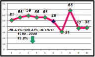 Lo precedente, puede conducir a cambios conceptuales y clínicos, que provoquen una reducción en la indicación y realización de restauraciones coladas de oro. En estudios de productividad realizados por el operador en su clínica, durante más de 25 años, se han podido constatar los resultados de la aplicación de estos cambios en la actividad profesional. En efecto, en la segunda mitad de la década de 1990, se observó un descenso de 19.8% en el uso de inlays/onlays de oro ( IOOs) (Fig. 1), y aumentos de 107.6% en el número de inlays/onlays cerámicos adheridos instalados (IOCAs) (Fig. 2) y de 44.7% en la aplicación de resinas compuestas directas fotopolimerizables posteriores (RCDPs) (Fig. 3).