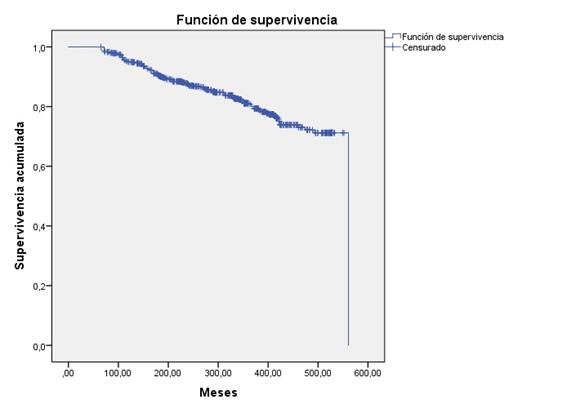 La tasa de falla anual fue de 0.08%. La sobrevida media total estimada, según el método de Kaplan-Meier, fue de 85% a los 25 años y de 77.4% a los 39 años y 10 meses (Fig. 4).