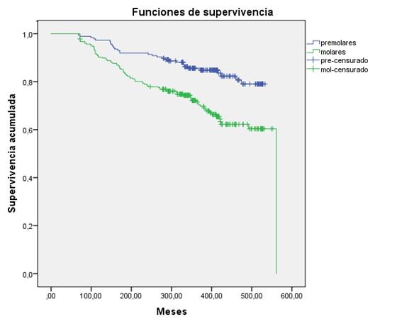 De los 120 fracasos, 89 se perdieron en molares y 31 en premolares. Hubo una sobrevida significativamente mayor en los premolares (Log Rank Test, p < 0.0001). La sobrevida media estimada, según fórmula de Kaplan-Meier, fue de 479.8 meses (39 años y 11 meses) para los premolares y de 437,4 meses (35 años y 5 meses) para los molares (Fig. 6).