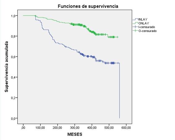 Al analizar el tipo de restauración, 424 IOOs en función eran Onlays y 112 Inlays . Hubo una diferencia estadísticamente significativa entre los onlays e inlays en función, entre los grupos A- y B- (OR = 13.9; p < 0.0001). Fracasaron 38 Onlays y 82 Inlays. Los onlays tuvieron una sobrevida significativamente mayor (Log Rank Test, p < 0.0001). La sobrevida media estimada, según fórmula de Kaplan-Meier, fue de 498.4 meses ( 41 años y 6 meses) para los onlays y de 402.2 meses (33 años y 6 meses) para los inlays (Fig. 7).
