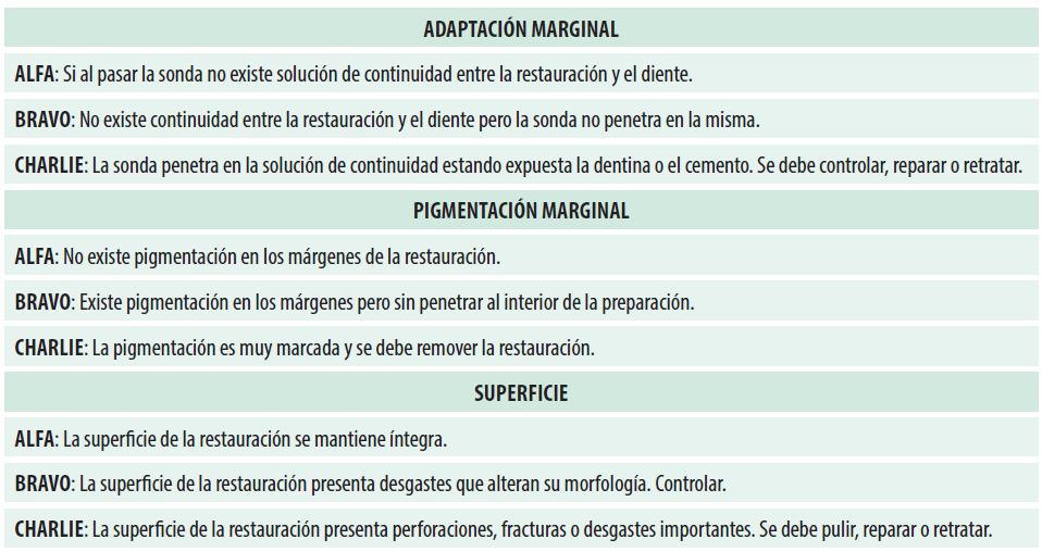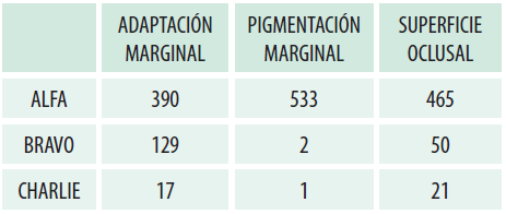 Para establecer la calidad de los IOOs, la adaptación marginal (AM), la pigmentación marginal (PM) y la superficie oclusal (S) fueron las variables evaluadas según los criterios de Ryge (40, modificados por los autores (Tabla 1).