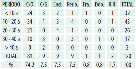 Las causas de su realización fueron: lesiones cariosas 557, endodónticas 85, requerimientos funcionales 7, traumatismos 4 y enfermedad periodontal 3.