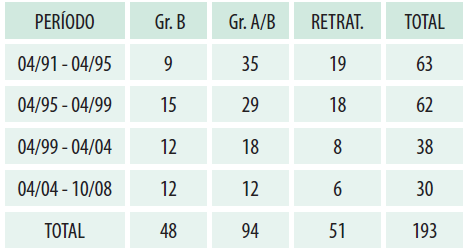 . Distribución de los IOOs en función instalados en el grupo B-, después de Abril de 1991, de acuerdo al período de realización y al origen del IOO (Gr. B= IOOs instalados en pacientes nuevos; Gr. A/B = IOOs nuevos instalados en pacientes del grupo A -; retrat. = IOOs perdidos en grupo A- retratados).
