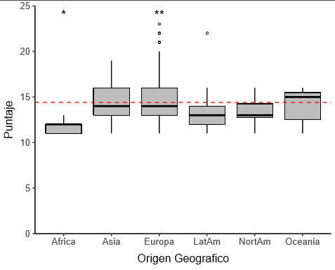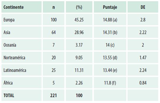 Respecto al origen geográfico, el continente con mayor número de ensayos clínicos publicados fue Europa con 100 artículos (45.25%) y el continente con menor cantidad de artículos publicados fue África con 5 artículos (2.26%). La misma distribución se repite al evaluar la CM por continente. Europa el continente obtiene el promedio de CM más alta con 14.88 puntos en la EM, mientras que el continente que presentó la CM más baja fue África con 11.8 puntos promedio (p = 0.003) (Tabla 2) (Fig. 3).