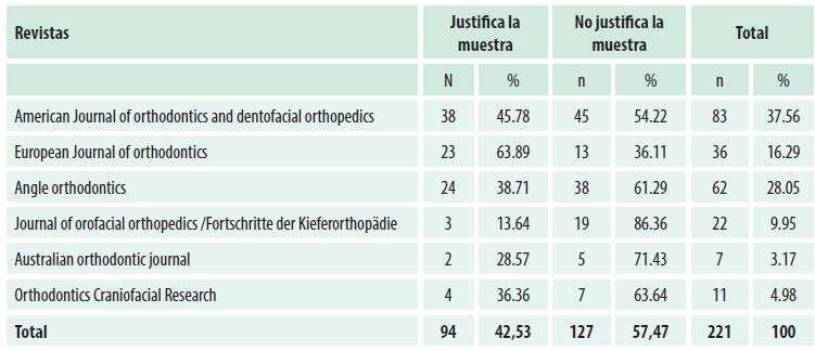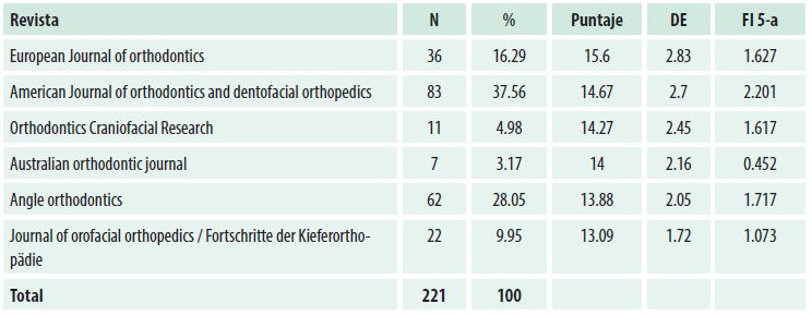 Las maloclusiones, corresponden a la tercera alteración de mayor prevalencia, e impacto psicosocial9. Casi un tercio de la población evaluada, según Bilgic (2014) tienen una necesidad obligatoria de tratamiento ortodóncico10. Por otra parte, en un estudio realizado en Chile el 96,2% de los estudiantes examinados presentó algún tipo de maloclusión9. Dada la importancia de los temas de ortodoncia a nivel mundial es conveniente acercarse a la realidad de esta actividad científica y de divulgación del conocimiento por lo que este estudio plantea describir la CM de los estudios clínicos de ortodoncia de las seis revistas con mayor factor de impacto (FI) indexadas en el Institute for Scientific Information (ISI) entre enero del 2012 y diciembre del 2016.