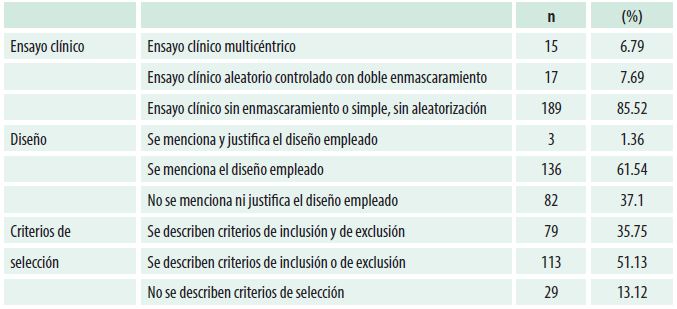 El primer dominio de la EM, analiza el tipo de ensayo clínico realizado, siendo el ensayo clínico sin enmascaramiento o simple, sin aleatorización el más utilizado en el área de ortodoncia con 189 artículos (85.52%). mientras que los ensayos clínicos multicéntricos mostraron ser los menos frecuentes con 15 artículos (6.79%) (Tabla 4).