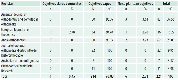 Luego analizar los objetivos expuestos en los trabjo, mediante la escala MinCir, se establece que los objetivos fueron vagamente presentados en el 96.77% de los estudios clínico publicados en la revista AO. Al mismo tiempo que el 100% de los trabajos de igual tipo publicados en las revistas JOOF, AOJ y OCFR presentaron la calificación 2 en este item, es decir que sus objetivos fueron vagamente presentados (Tabla 5).