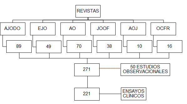 Selección de estudios. Se encontraron 271 artículos en total: 89 artículos que se definían como ensayos clínicos en la revista AJODO, 49 en la revista EJO, 70 en la revista AO, 38 en la revista JOOF, 10 en la revista AOJ, 16 de la revista OCFR y 50 artículos fueron descartados por no cumplir con los criterios de selección para ser clasificados como ensayo clínico. Todos fueron obtenidos en texto completo (Fig. 1).