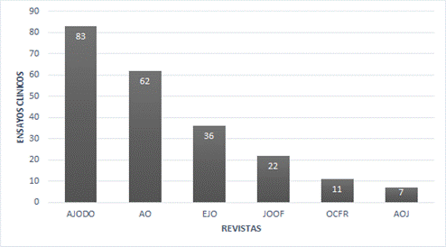 Características de las revistas. La revista con mayor cantidad de ensayos clínicos publicados es la AJODO con 83 artículos indexados en esta categoría, mientras que la revista con menor cantidad de ensayos clínicos publicados es la AOJ con tan solo 7 artículos (Fig. 2).