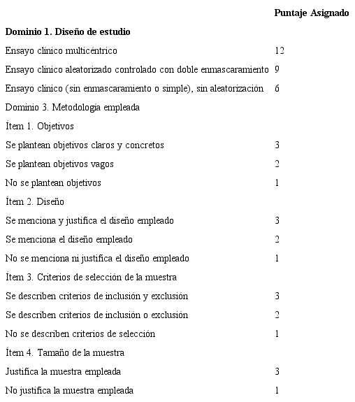 Todos los estudios seleccionados fueron analizados mediante una adaptación de la herramienta EM2 (Tabla 1), siguiendo las instrucciones publicadas por sus autores11. De los 3 dominios que conforman la escala, sólo se consideraron dos para este trabajo: el primero, relacionado con el tipo de diseño del estudio y el tercero, el cual está compuesto por 4 ítems los cuales evalúan la metodología empleada en el estudio2. Se eliminó el item Dominio 2 Población estudiada por factor de justificación. De esta forma la puntuación final varía entre 10 y 24 puntos, como mínimo y máximo respectivamente.
