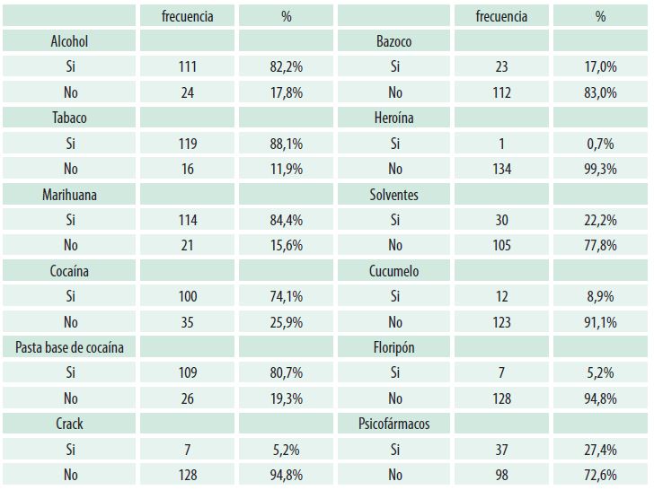 El policonsumo de drogas fue frecuente en la población objeto de estudio. Predominó el uso de drogas legales y algunas ilegales, además de psicofármacos sin prescripción médica y otras sustancias en menor proporción (ver Tabla 1).