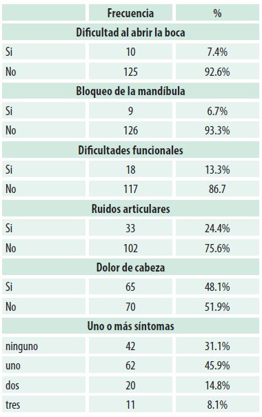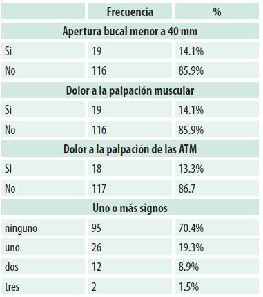 La prevalencia de signos actuales de TTM y presencia de un signo o más se describe en el Tabla 2. La prevalencia de síntomas actuales de TTM y presencia de un síntoma o más de uno fue se describe en el Tabla 3.