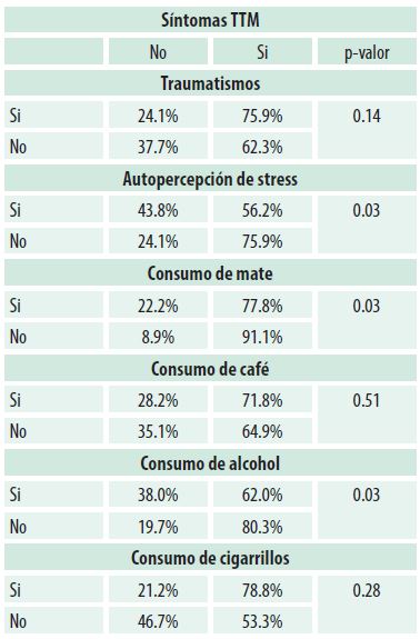 Análisis estadístico: se realizó el análisis descriptivo para la presencia de signos y síntomas actuales de TTM a través de tablas estadísticas de frecuencia absoluta y relativa. El análisis de la asociación entre variables cualitativas se realizó mediante la confección de tablas de contingencia y la prueba chi cuadrado, con nivel de significación alfa de 0,05. Se evaluó la posibilidad de asociación entre variables de respuesta: signos y síntomas actuales de TTM con variables explicativas como traumatismos de cabeza, cuello o mandíbula, autopercepción de estrés, consumo habitual de mate, café o té, alcohol y cigarrillos. Cada variable binaria se registró como presente o ausente.