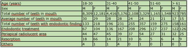 Para determinar la frecuencia de los hallazgos endodónticos se realizó un análisis a partir de las radiografías como un marcador de lo que ocurre en la población adulta (Tabla 1) y en los dientes tomados como una unidad independiente (Tabla 3). Para ambos casos, se reporta la distribución en el total de la muestra, por sexo y edad